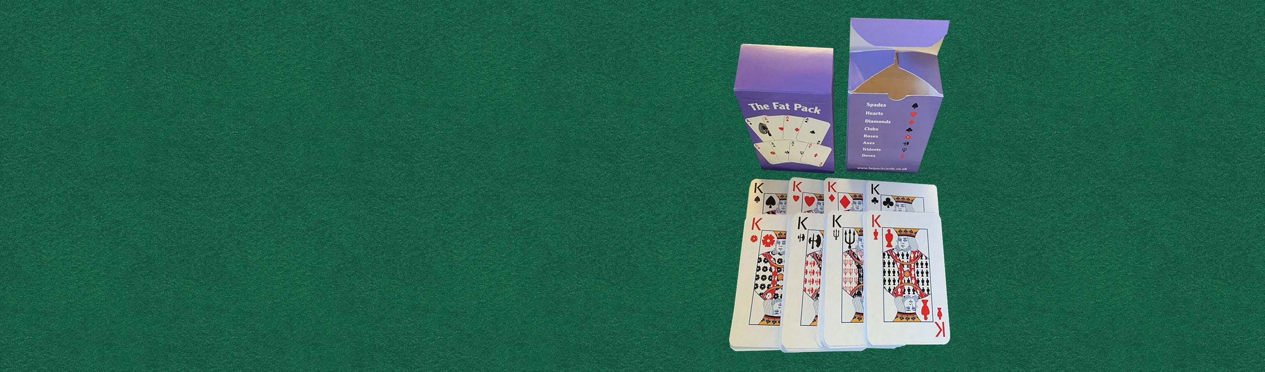 Zusätzlich zu den vier uralten Farben Pik, Herz, Karo und Kreuz gibt es jetzt vier neue, minderwertige Farben, zwei schwarze und zwei rote, die in absteigender Wertreihenfolge bezeichnet werden: Rosen, Äxte, Dreizacke und Tauben. „The Fat Pack“ ist wirklich ein einzigartiges Kartenset.