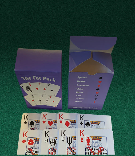 Zusätzlich zu den vier uralten Farben Pik, Herz, Karo und Kreuz gibt es jetzt vier neue, minderwertige Farben, zwei schwarze und zwei rote, die in absteigender Reihenfolge ihres Wertes benannt sind: Rosen, Äxte, Dreizacke und Tauben. „The Fat Pack“ ist wirklich ein einzigartiges Kartenset.